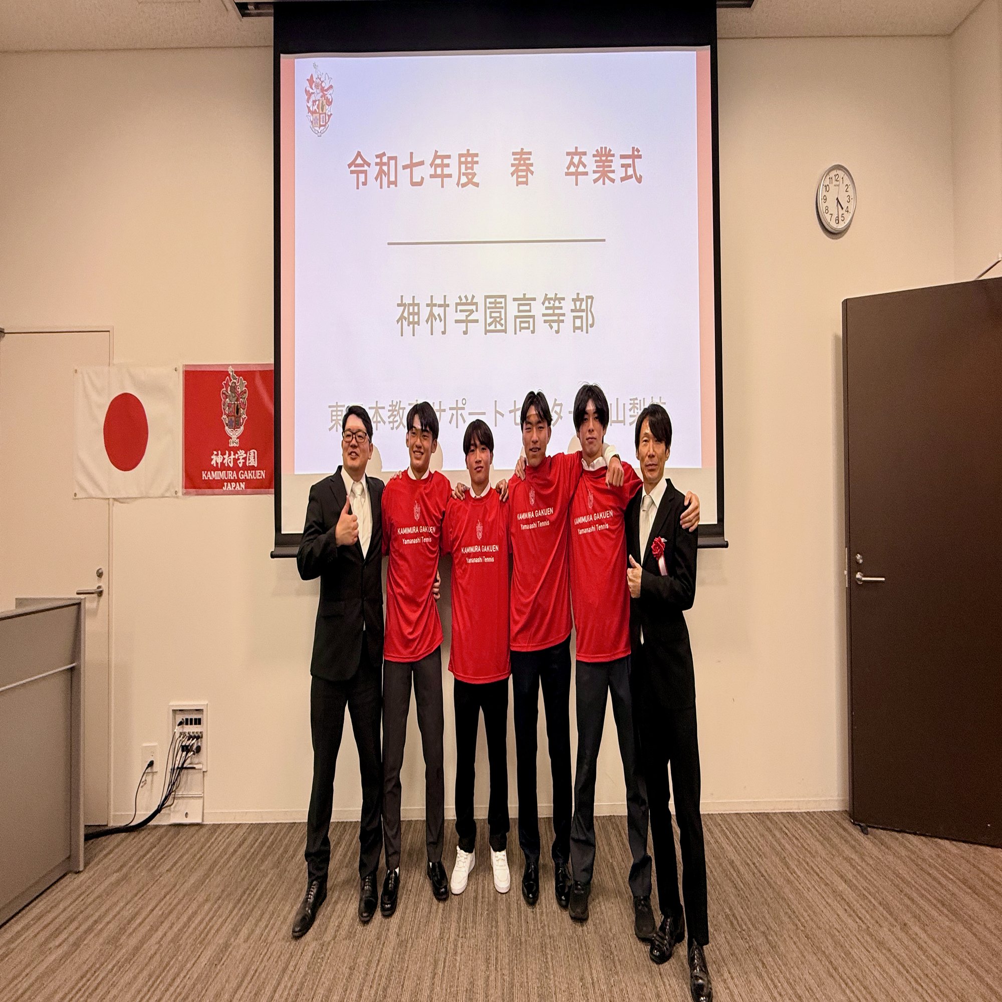 卒業のお祝いとして、神村学園 山梨 テニス部のオリジナルTシャツをプレゼントさせてもらったのですが、卒業式が終わったあと、みんなすぐに着てくれて、そのまま記念撮影をしました。